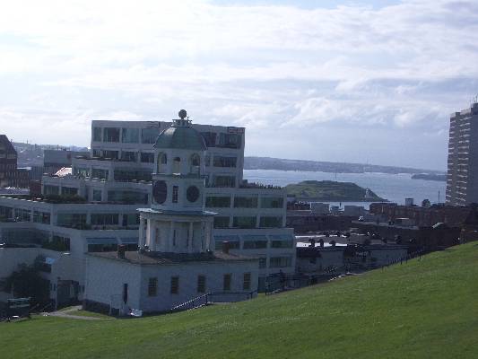 The Halifax Old Town Clock from the Citadel with Georges Island in the background.