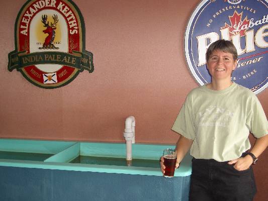 Jane with beer at lunch at Salty's in Halifax.