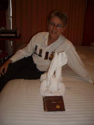 Pam with our nightly towel sculpture.