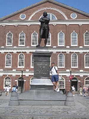 Jane and statue of Samuel Adams in front of Faneuil Hall.