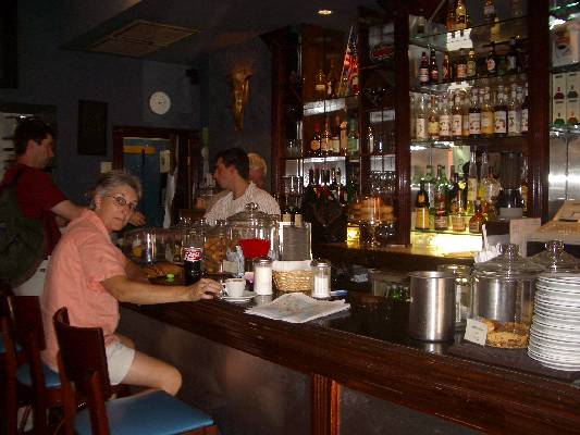 Pam drinking a coke in a little Italian coffee shop in front of the Old North Church.
