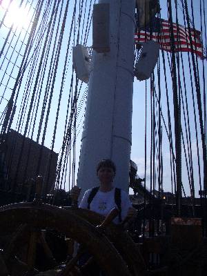 Jane at the helm of the USS Constitution in the Charlestown Navy Yard.