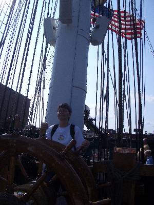 Jane at the helm of the USS Constitution in the Charlestown Navy Yard.