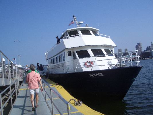 Pam approaches the water shuttle which brought us from the Charlestown Navy Yard to the New England Aquarium at Long Wharf.