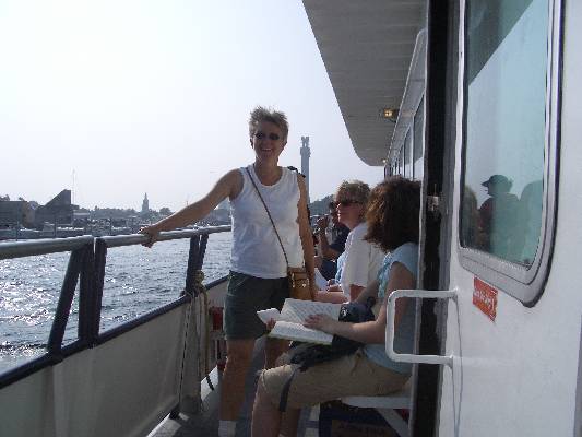 Pam on the Provincetown ferry with the Pilgrim's Tower in the background.