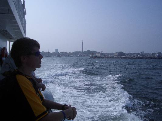 Jane on the Provincetown ferry with the Pilgrim's Tower in the background.