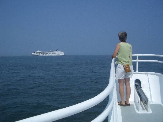Pam on the prow of the Martha's Vineyard ferry looking towards the Dawn.