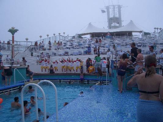 rFamily team perform by the pool.